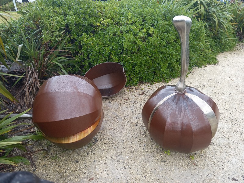It was a good choice. There’s a five kilometre coastal walk and the separate Didsbury Art Trail. We opted for the coastal walk, which does also intersect with parts of the sculpture trail. Our walk started in sunshine but about half way around, the clouds loomed dark and the rain followed not long after. It wasn’t cold, the showers weren’t heavy, andthe rain jackets coped okay. By the time we were back at the ferry terminal in Catalina Bay, the rain had stopped.
