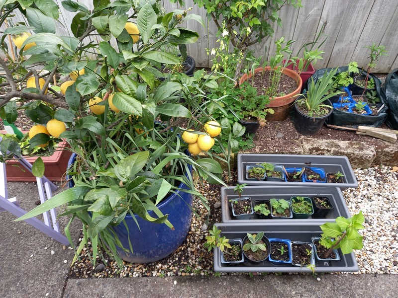 We arrived home today to find the garden largely as it was when we left. Cuttings have survived. The troughs were filled with water, so clearly there’d been rain, but not enough, or not sitting long enough, for the roots to rot. I’m happy. The passion fruit vine, though, has clearly been buffeted by strong winds, to an extent that I’m wondering if it will recover. The sparrows have also been feasting at the salad bar – I was watching them this evening, hopping down from the fence on to nip at the leaves of the Tom Thumb lettuces. I’m not too worried. The lettuces were ready for picking when we left a fortnight ago, so probably somewhat bitter for us at this stage. Elsewhere in my mini-potage, the peas are doing okay, though I need to re-construct their string support. The zucchini and French beans are coming along, and finally, there are runner beans sprouting. However, nothing has put on much growth. Those of you who know me will know I’m a newbie when it comes to vegetable gardening. I opted for vegies because it seemed a good thing to do in a rented property where we might be moving on at any time – it’s easy to leave annuals and vegetables, but I don’t want to put my perennials anywhere where they may need to be lifted and shifted.